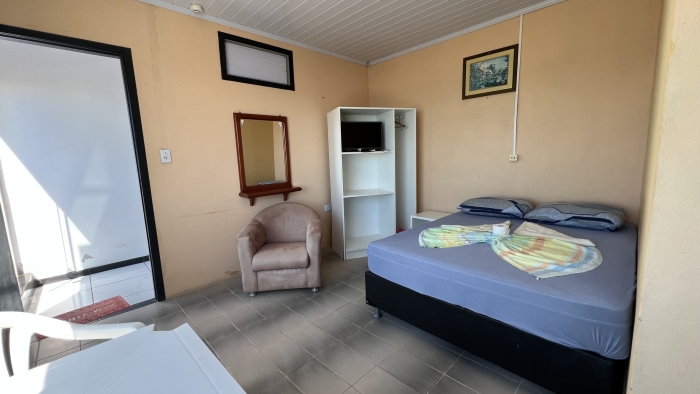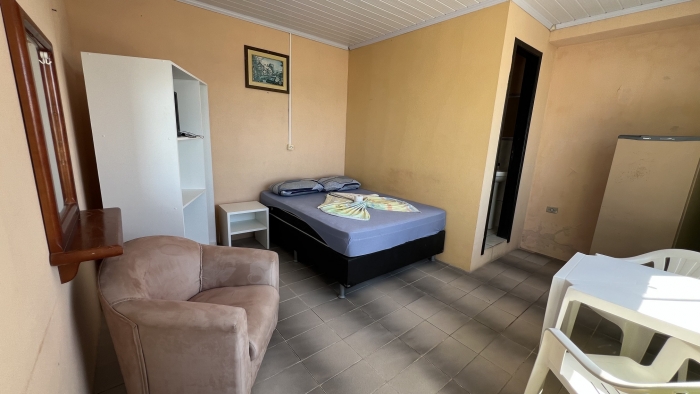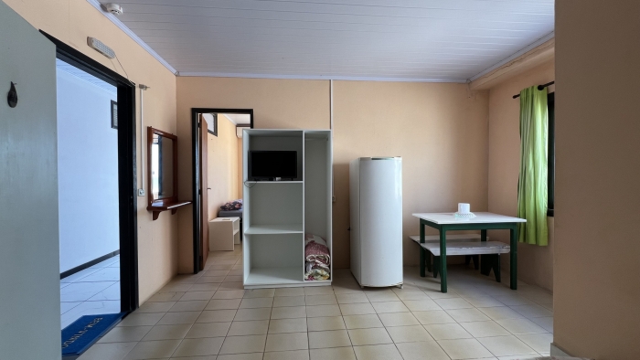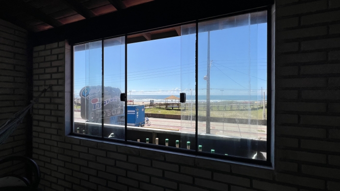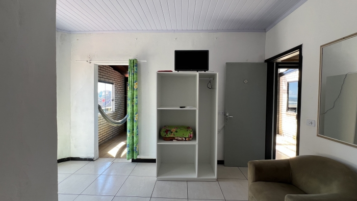 Oferecemos apartamentos com 1 ou 2 dormitórios de frente para o mar, com TV, frigobar, cama box, internet, estacionamento coberto, ar condicionado, câmeras de segurança, café colonial, ventilador de teto e cozinha coletiva.